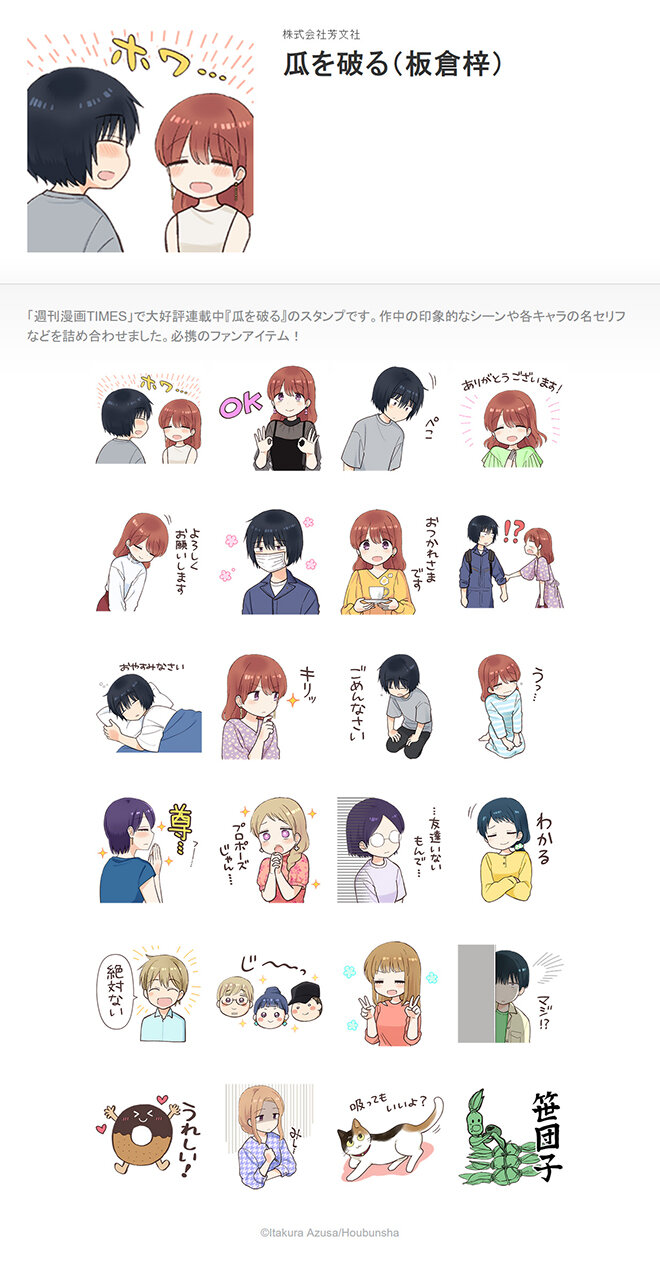 7巻発売を記念して「瓜を破る」のLINEスタンプが発売されました!作中の印象的なシーンや各キャラクターの名セリフが多数描きおろされた、ファン必携アイテムです。ぜひ使ってみてください!